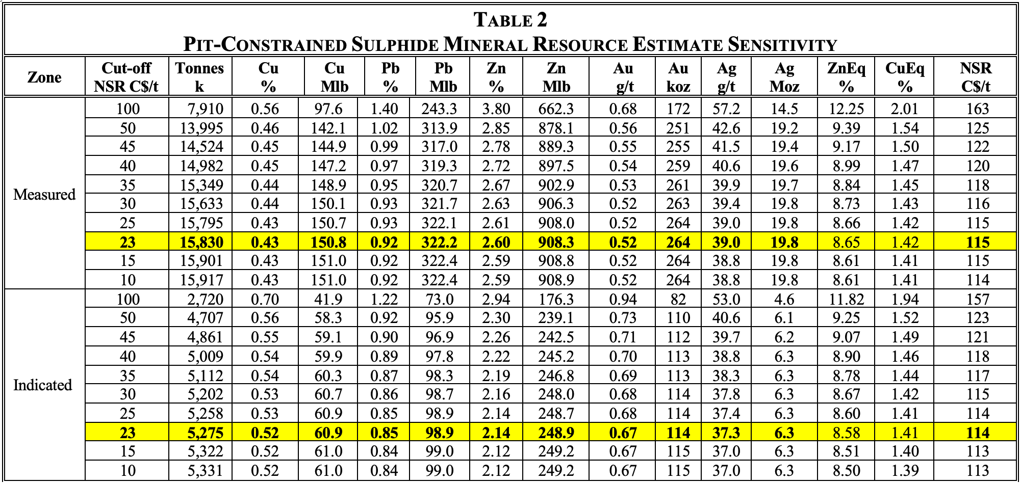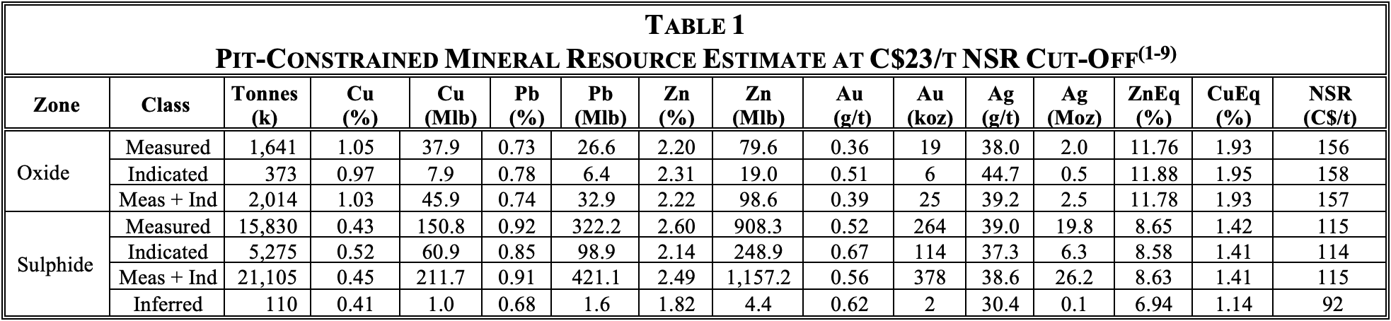 - The Mineral Resource Estimate was based on July 2023 approx. consensus economics forecast US$ metal prices of $4.00/lb Cu, $1.25/lb Zn, $0.95/lb Pb and $23/oz Ag at a $0.76 USD/CAD exchange rate.