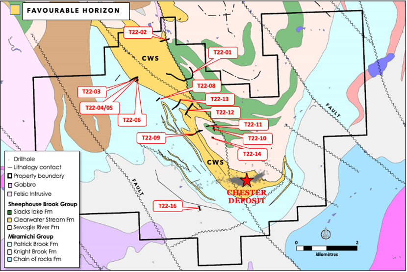 The Chester copper deposit (“Chester”) is a volcanogenic massive sulphide (“VMS”) resource containing three zones; the Central Zone (massive sulphide), the East Zone (massive sulphide), and the West Zone (Copper Stringer), which are all located near surface. Previous mining development in 1974 included a 470-meter decline targeting the West Zone and produced 30,000 tonnes of bulk samples grading +2.0% Cu (Geoscience Canada, McCutcheon, 2020). No other development has occurred on the property.