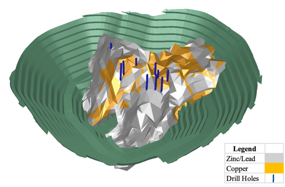 Approximately 3,100 kilograms from fresh diamond drill cores totaling about 244 meters of material was selected from the 1,000 meter drill program completed (see Photo A). It comprised 10 new drill holes targeting the initial phases of the mine design (see Photo B). Samples are in transit to SGS for assay preparation and testing. Examples of the massive sulphide intervals intersected include pyrite, chalcopyrite (copper), and sphalerite (zinc) sulphides (see Photo C1 – C2).