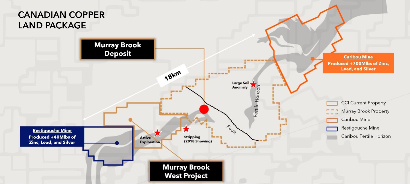 The property spans 7 kilometres of strike on the prospective Caribou ore horizon and is 100% owned by Canadian Copper. Murray Brook West represents an excellent opportunity for further prospecting and drilling activities given its location between the Caribou Mine and Restigouche Mine. Promising geochemical and geophysical anomalies, as well as having the right geologic ore horizon.